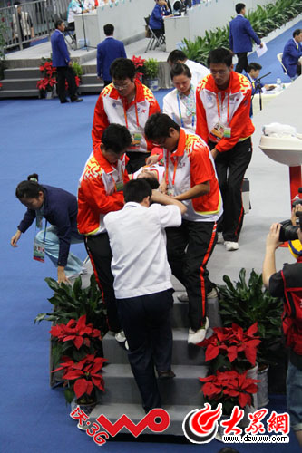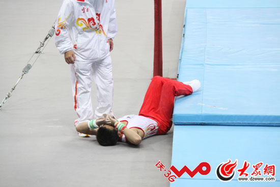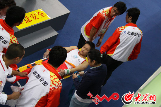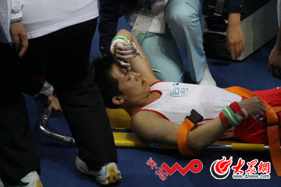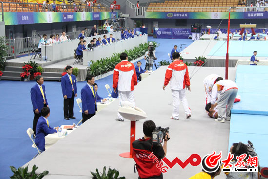 云南隊選手鄧云川在單杠項目中不慎跌杠受傷,被工作人員抬出場外。