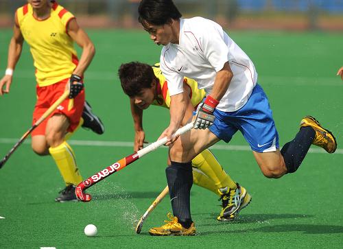 10月28日,內蒙古隊球員孟立志(左)在比賽中帶球突破。當日,在第十一屆全運會男子曲棍球決賽中,內蒙古隊以1比3負于遼寧隊,獲得亞軍。
