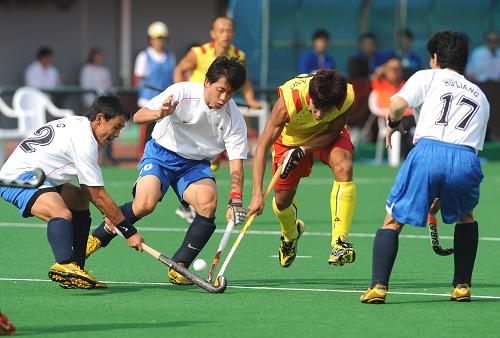 10月28日,內蒙古隊球員在比賽中包抄遼寧隊球員董陽(右二)。當日,在第十一屆全運會男子曲棍球決賽中,內蒙古隊以1比3負于遼寧隊,獲得亞軍。
