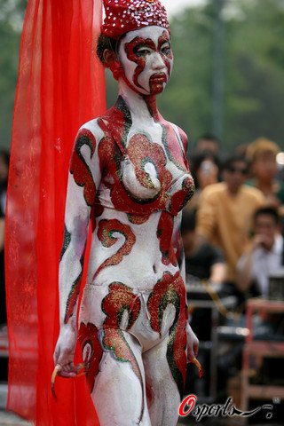 ,猶如燃燒的火焰。據(jù)化妝師介紹,此化妝造型的靈感來(lái)源于4月28日公布的全運(yùn)會(huì)“如意”火炬,人體彩繪的圖案就是古時(shí)的如意。