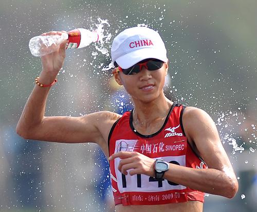 10月24日,廣東隊選手劉虹慶賀勝利。當日,在第十一屆全運會田徑女子20公里競走決賽中,劉虹以1小時28分11秒的成績奪得金牌。 新華社記者劉大偉攝