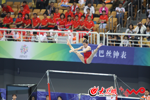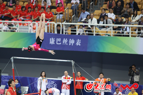 大眾網-山東聯通3G聯合報道(記者 明清 新婷 爾印 吳哲 洪棟)今晚在濟南奧體中心舉行的第十一屆全 運會體操男女單項決賽剛剛落下帷幕。最后一輪女子高低杠的決賽,可謂群星璀璨,何可欣、江鈺源、楊伊琳、吳柳芳、何寧、譚思欣、楊紅茜、肖康君經過激烈的較量,最終,高低杠女皇何可欣不負眾望,以大比分領先,奪得金牌,廣東隊兩將楊伊琳和吳柳芳分別獲得銀、銅牌。