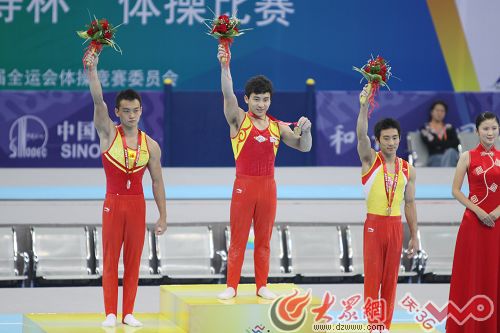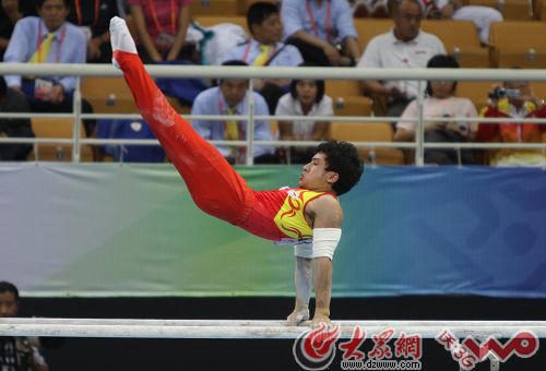 大眾網(wǎng)-山東聯(lián)通3G聯(lián)合報道(記者 明清 新婷 爾印 隋喬 洪棟)十一運(yùn)體操比賽男女單項的比賽正在進(jìn)行。男子雙杠決賽剛剛戰(zhàn)罷,馮喆豪奪金牌,加冕冠軍,王冠寅摘得銀牌 ,獲得第三名的是全能王滕海濱。