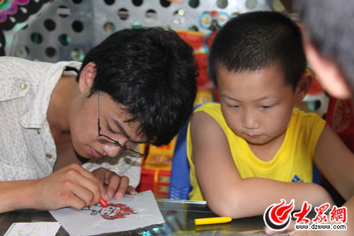在楊家埠風箏展區,來自浙江的游客陳先生正陪著自己7歲的女兒一起學習扎制風箏,小女孩手里拿著福娃樣式的紙面,一板一眼的制作,還不時地向一旁的楊家埠風箏傳承人郭紅利請教,郭師傅則親自演示制作風箏的技巧。