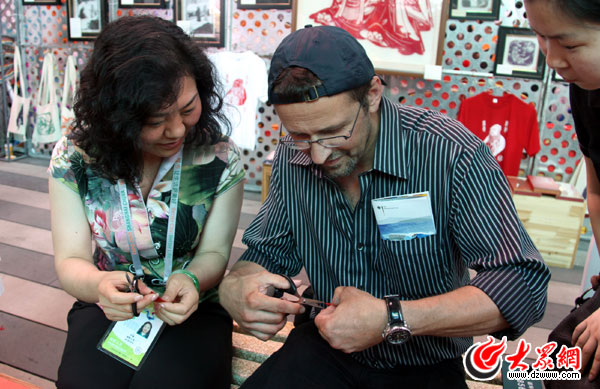 大眾網上海7月10日訊(特派記者 吳哲 劉國棟)“希望更多的人了解山東的文化,體驗到山東人的熱情。”10日,在山東周非物質文化遺產交流活動上,來自山東泰安的著名剪紙藝術家盧雪技驚四座。盧雪高超的剪紙技巧不僅吸引了眾多游客,連來自德國的老外kai也為她輪美奐的剪紙所震撼,興奮的當場拜師學藝。