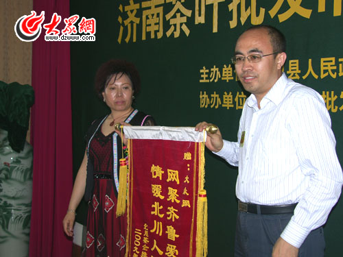 今天下午的推介會,來濟的茶商代表將印有“齊魯情重,力促兩地茶企牽手,茶葉雖輕,承載北川重建希望”的錦旗送到大眾網(wǎng)、生活日報和濟南茶葉市場的領導手中,表達他們對山東人民的感謝。濟南的俏泉茶葉公司負責人郭玉霞說到動情處眼含熱淚,“北川茶品質品質好、無污染,想在山東順利的銷售出去需要山東朋友的大力推介,在這里,我感謝山東,感謝濟南茶葉市場好心的茶商老板們,希望我們成為朋友,希望你們能繼續(xù)幫助北川茶農和茶葉企業(yè),幫助我們更快的恢復重建。”