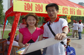志愿者與愛(ài)心大使書勻一起進(jìn)行獻(xiàn)血宣傳