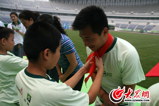小朋友為奧運跳水冠軍王峰佩戴紅領巾