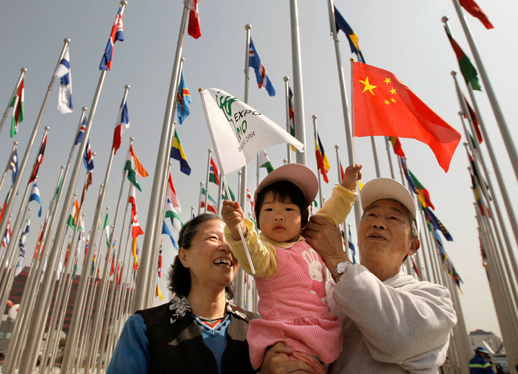 4月30日上午,兩位老人帶著孫女來到世博園旗林廣場。中國2010年上海世博會開幕式將于4月30日晚在世博文化中心舉行。新華社記者王頌攝