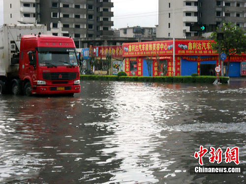 在博頌路與豐慶路部分路段,記者看到路面積水嚴重,積水足以淹沒腳面甚至小腿,處隨處可見穿著皮鞋、休閑鞋的行人跳入水中穿越馬路。有些行人為了避免弄濕鞋子,將塑料袋套在鞋上,涉水過路。
