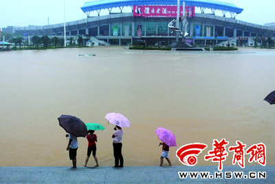 昨日晚7時24分,安康市的金州廣場已是一片汪洋 本版照片由本報記者 蔡勇 李振 攝
