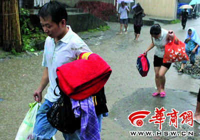 下午5時34分,張模安也搬起了東西,他住的是一棟三層小樓,正和幾個兄弟將電冰箱、洗衣機等大件電器往二樓搬。他說,照這樣下去,要不了多久一樓就沒法呆了。在他家門前,記者見到了心石村村委會的仇主任,滿頭雨水的他正在挨家挨戶地通知緊急撤離,“現在是動員老弱病殘離開!
