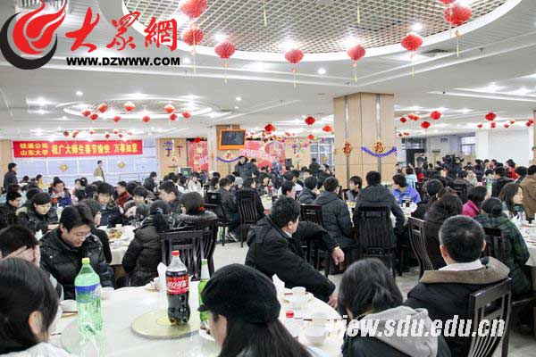 據了解,從1995年開始,山東大學每年春節都會舉辦師生聯歡會,讓留守學生感受到來自學校的關心和溫暖。今年放假后,學校還組織了安全大檢查,對學生公寓的供水管道、供電線路、供暖管道等設施進行了保養和維修,并安排專人值班方便學生及時購電,保證學生公寓水、電、暖的充足供應。春節到來之際,每棟公寓樓內都張貼了春聯和“福”字,讓同學們感受到了家的溫馨。同時,山東大學學校飲食管理服務中心等部門早已提前安排,在留守學生相關校區設置了值班食堂,共安排了200多名員工堅守崗位。大年初一,山大飲食管理服務中心還為留校學生提供免費水餃。