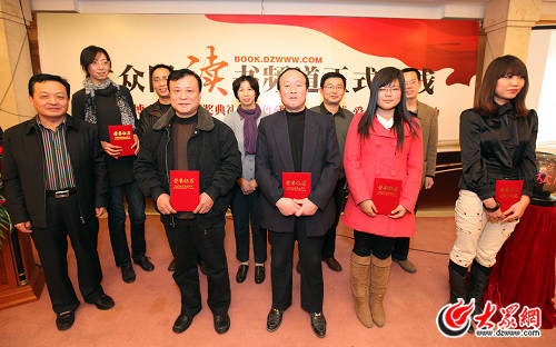 山東畫報出版社副總編輯傅光中,齊魯書社副總編輯昝亮,山東教育出版社副總編輯陸炎,明天出版社副總編輯賈廣勝,《當代小說》副主編劉照如為眾眾微博小說大賽三等獎獲得者頒獎并合影留念。(大眾網記者 曹亮 攝)