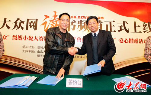 大眾網副總編輯曲濤與山東畫報出版社副總編輯傅光中簽約(大眾網記者 曹亮 攝)