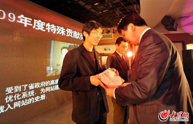 大眾網(大眾傳媒股份有限公司)總編輯助理曲濤為獲特殊貢獻獎的員工頒獎。(記者 郭建政 曹亮 攝)