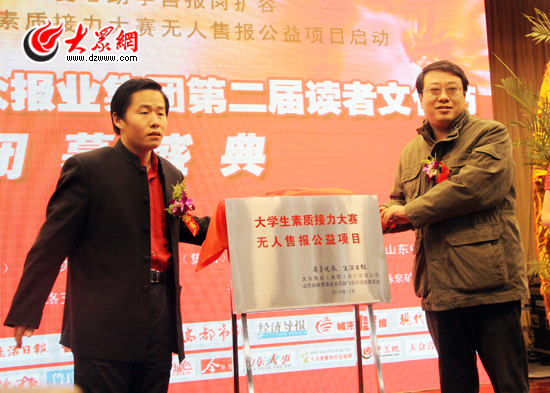 大眾報業集團總編輯助理、齊魯晚報、生活日報總編輯藍海(右)、山東省教育基金會馬踏飛燕專項教育基金主任馬飛為“大學生素質接力大賽無人售報公益項目”啟動揭牌。