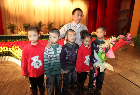 郭明義同志資助的五胞胎兄妹來到了報告會現(xiàn)場,給郭明義同志獻花。