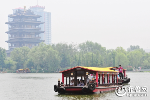 6月20日上午,全國網絡媒體黃河三角洲采訪考察活動采訪團來到大明湖景區,乘船采訪報道(記者 張曉博 攝)