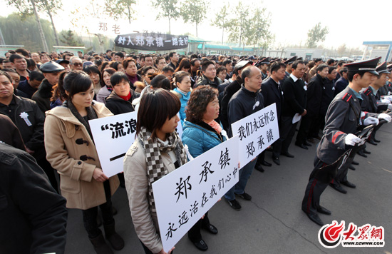 16日下午1時,濟南市殯儀館追悼大廳外500余名泉城市民神情悲痛,他們帶著白花,手舉用寫著悼詞的橫幅,共同送別一位好人,全國道德模范提名獎獲得者、流浪兒之父鄭承鎮。