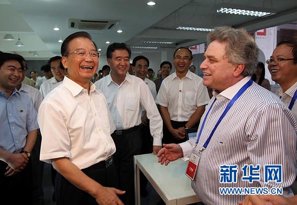 8月20日,溫家寶在中國(深圳)設(shè)計之都創(chuàng)意設(shè)計產(chǎn)業(yè)園調(diào)研時,與一家美國創(chuàng)意企業(yè)負責人交談,了解中外企業(yè)合作研發(fā)和生產(chǎn)情況。新華社記者 劉衛(wèi)兵 攝