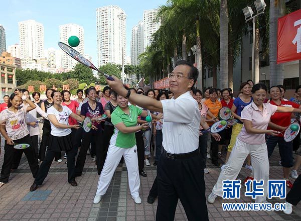 8月21日,溫家寶來到深圳皇崗社區(qū)看望居民時,與居民們一同做柔力球運動。新華社記者 劉衛(wèi)兵 攝