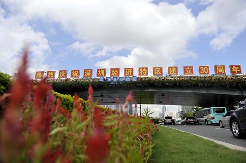 在深南大道深南金田立交橋上設(shè)立的“熱烈慶祝深圳經(jīng)濟(jì)特區(qū)建立30周年”標(biāo)語