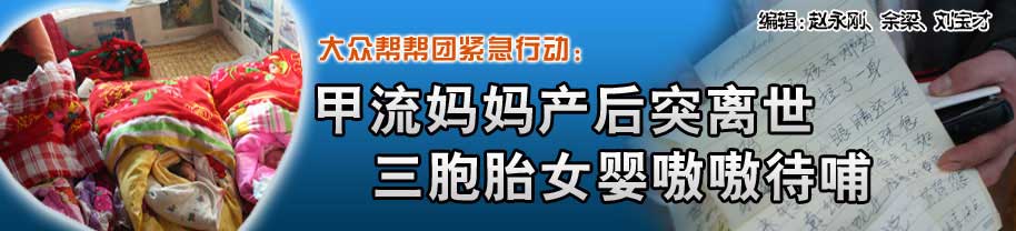 “三個嗷嗷待哺的寶寶就這么沒了媽媽,心里真不是滋味。”嬰貝兒市場部賈經理的話里帶著一絲顫抖。平度馬戈莊鎮甲流孕婦生下三胞胎女兒后離開人世的事情發生后,大眾網立即啟動大眾幫幫團,對這個家庭進行幫助。幫幫團成員嬰貝兒母嬰購物廣場得知此情后,當即決定配送六萬元左右的嬰幼兒用品,資助這個不幸的家庭。明天(1月7日),大眾網記者將和嬰貝兒公司的員工,帶著首批價值萬余元的貨物趕往平度看望三個孩子。