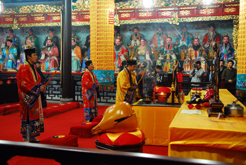 道教科儀表演在上午10點30分準時開始,只見幾名身著道袍的道士,手持法器進入壇場,開始吟唱古老的曲調,記者們便在一旁認真觀看。據導游介紹,“齋醮科儀”是指醮禱活動所依據的一定法規,“齋”的原意指齊和凈,后為齋戒、潔凈之意,指在祭祀前,必須沐浴更衣,不食葷酒,不居內寢,以示祭者莊誠!磅础钡脑馐羌溃瑸楣糯Y儀。《說文》曰其一為冠娶二為祭祀。道教繼承并發展了醮的祭祀一面,借此法以與神靈相交感。
