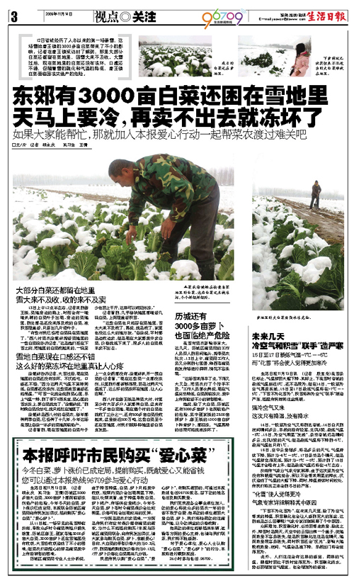 “大家來買愛心菜”做到的,不僅是讓因雪受災的菜農順利度過困難時期,讓出錢出力的讀者在心理上完成了一次跨越式滿足,更重要的面向廣大市民展現一種寬厚而又積極的服務。