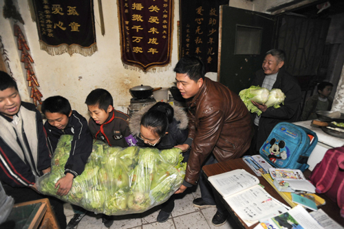 生活日報記者和愛心市民一起將白菜送到老人家中。左慶攝