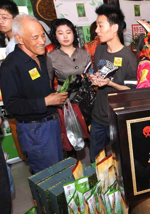 記者任鵬采訪北川茶熱賣。(記者 左慶攝)