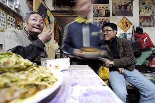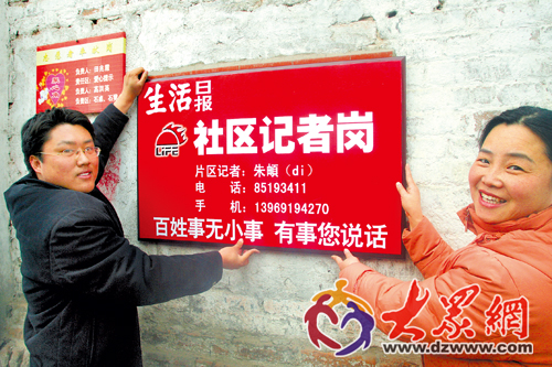 2007年3月10日,生活日報社區記者朱頔和濟南市天橋區官扎營后街社區居委會主任李英鮮一起將記者朱頔的“大名片”掛在了胡同里。(郭建政 攝)