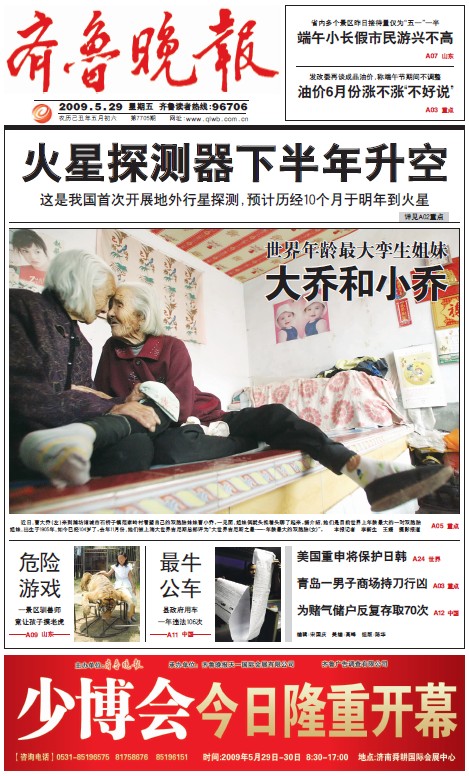 《世界年齡最大孿生姐妹大喬小喬》、《104歲的大喬小喬——世界年齡最大孿生姐妹的幸福一天》 (齊魯晚報 記者:王媛、李新生 編輯:宋國慶、蔡宇丹)