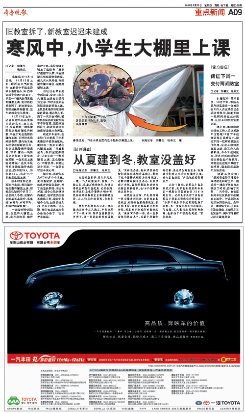 《天寒地凍 大棚上課》《寒風中 小學生大棚里上課》《71名小學生昨搬進新教室》 (齊魯晚報記者:季善文、張希文 齊魯晚報編輯:呂華遠、楊飛越、王世新)
