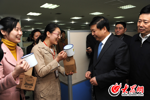 眾眾微博工作人員向姜大明省長贈送帶有眾眾微博標志的水杯。大眾日報記者湯序民 攝