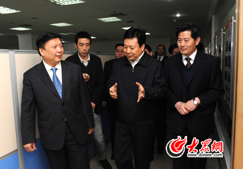 省委常委、宣傳部長李群向姜大明省長介紹新媒體發展前景。大眾日報記者 湯序民攝