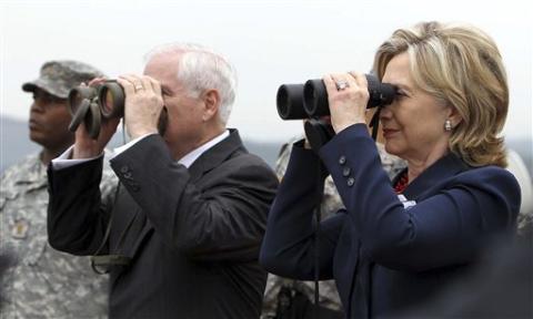 克林頓國務卿和蓋茨部長在板門店非軍事區(qū)觀測對面朝鮮