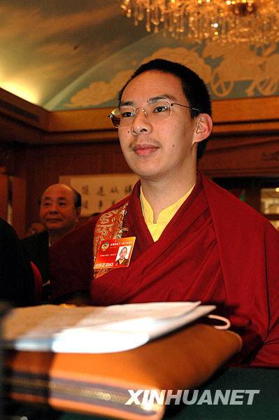 當日下午,全國政協委員十一世班禪額爾德尼·確吉杰布出席全國政協十一屆三次會議宗教界小組會,討論政府工作報告。新華社記者任沁沁攝
