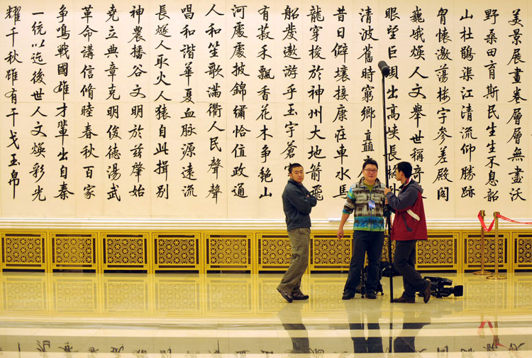 3月6日,幾名記者在北京人民大會(huì)堂金色大廳《中華頌》前等候采訪。 兩會(huì)期間的人民大會(huì)堂內(nèi),磅礴大氣的書畫作品映襯著媒體工作者身影的鏡頭隨處可見,不僅賞心悅目,也讓記者們在緊張的工作之余心情得到放松和舒緩。 新華社記者 李紫恒 攝