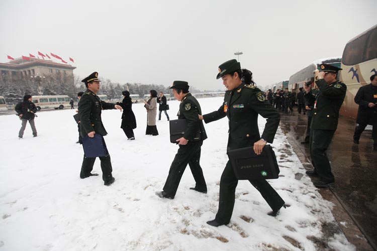 3月8日,中國人民解放軍總參謀部的代表踏雪趕往會場。 當(dāng)日,十一屆全國人大三次會議在北京人民大會堂舉行第二次全體會議。天安門廣場在一場春雪過后銀裝素裹。 新華社記者邢廣利攝