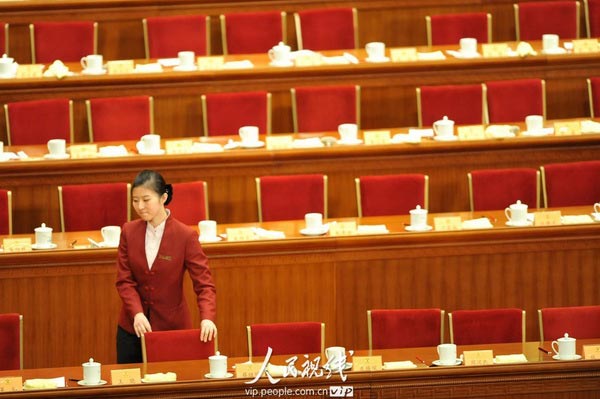 兩會期間,工作人員為代表委員們提供貼心細(xì)致的服務(wù)。他們也是兩會中的“明星”。