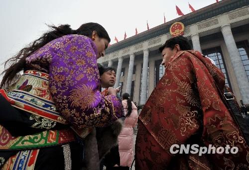 來自西藏高原的記者們3月初盛裝出現在北京人民大會堂,準備展開今年人大、政協“兩會”的新聞報道。中新社發 賈國榮 攝