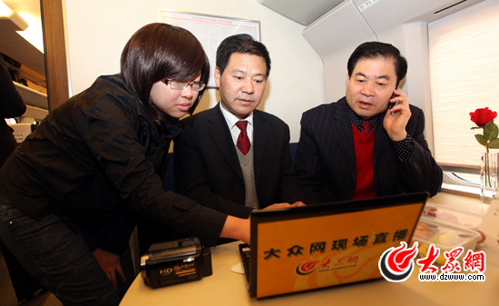 在赴京參加兩會的列車上,全國人大代表榮蘭祥(中)關注大眾網全國兩會新聞報道。大眾網特派記者 曹亮 趙新婷