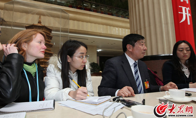外國美女記者采兩會。3月2日,在山東、安徽、遼寧、福建代表團駐地,一名路透社記者與國內記者一起采訪人大代表。大眾網(wǎng)特派記者 曹亮 攝影報道