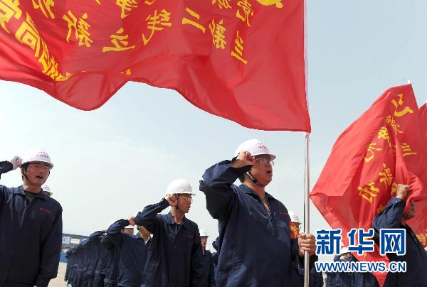 6月26日,參加創(chuàng)先爭優(yōu)的中國中鐵四局黨員代表進(jìn)行創(chuàng)先爭優(yōu)宣誓。新華社記者王雷攝