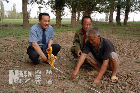 2008年6月11日,美岱召鎮(zhèn)美岱西營(yíng)子村,張章寶在田里和村民丈量土地。
