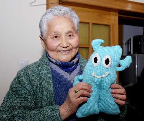 王逢老人展示她為孤殘兒童編織的“海寶”。新華社記者 劉穎 攝