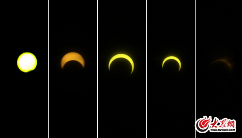 “媽媽,太陽被月亮吃了”今天下午,千年不遇的日環食如期現身濟南。記者在位于省城解放路的濟南雙達光電有限公司觀測點看到,很多市民冒寒過來觀看日環食。一位剛剛放學的小朋友看到日環食后大喊:“媽媽快看,太陽被月亮吃了”。 >>更多 周五太陽帶食而落 北京可觀日偏食此次環食帶我國東部地區只能看到帶食日落,北京處于偏食帶,只能看到日偏食,但觀測效果要好于去年。 >>更多 臺灣民眾15晚可觀賞日偏食天象十五日傍晚將發生本世紀環食時間最長的日環食天象,由于角度問題,臺灣地區僅能看見食分零點六五五的日偏食前半段過程。 >>更多 成都市民15日可欣賞到近3小時日偏食成都的日偏食初虧從15日15時17分開始,在16時48分達到食甚,到18時6分復圓,歷時近3個小時。>>更多 |