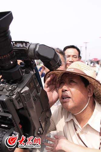 一位老人通過濟(jì)南電視臺的攝像機(jī)觀看日食
